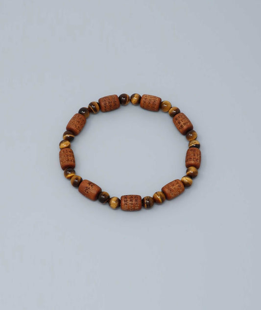 Sandalwood Prayer Bead Bracelet Hand-Engraved Heart Sutra with Tiger’s Eye Accent